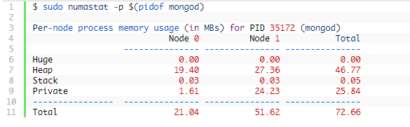 | 1 | $ sudo numastat -p $(pidof mongod) |