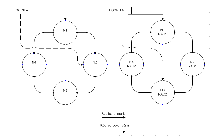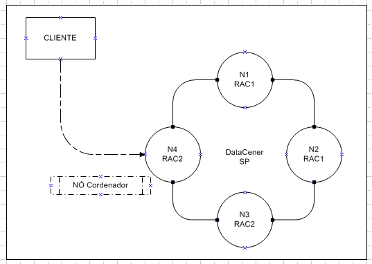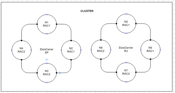 Como podemos ver no desenho acima, N1 e N2 fazem parte do Rac1 no DataCenter SP enquanto o N3 e N4 fazem parte do Rac2 também no DataCenter SP. Assim como N5 e N6 estão configurados no Rac1 do DataCenter RJ e os Nós N7 e N8 estão configurados no Rac2 do DataCenter RJ.