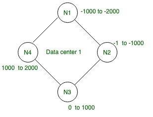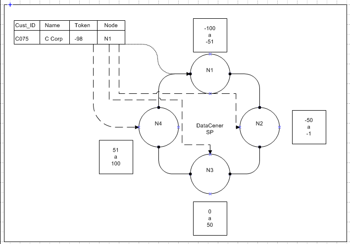 Na imagem a cima temos uma replicação de fator de três, ou seja, o dado será replicado para 3 nós no cluster pelo fator do range de token o dado é distribuído ao cluster para o Nó adjacente ao token correspondente. Neste caso o dado tem valor de -98 e o Nó N1 tem a distribuição de range de token entre -100 e -51. -98 entra dentro deste intervalo de range.